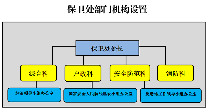 保卫处现设置有4个科室:综合科、户政科、安全防范科、消防科。学校社会治安综合治理领导小组办公室、国家安全人民防线建设小组办公室、反恐怖工作领导小组办公室设在保卫处,保卫处负责三个小组办公室的日常工作。