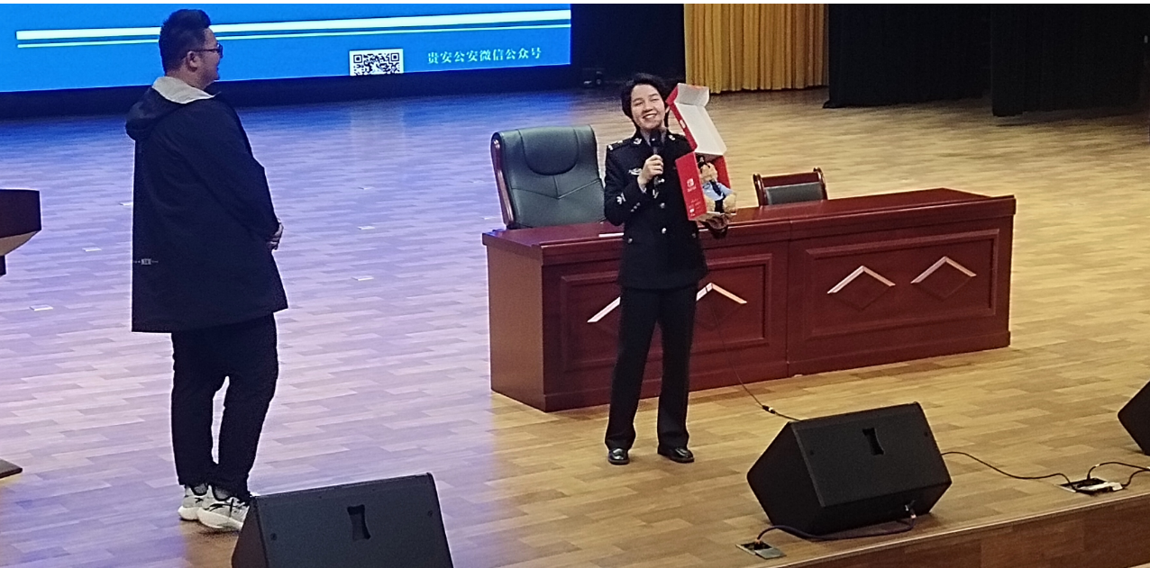 本次讲座邀请到贵安新区公安局侦防中心的袁孟蜻警官为全校师生进行反诈安全宣传讲座,她通过生动的反诈案例,与学生互动等方式进行反诈宣传教育。