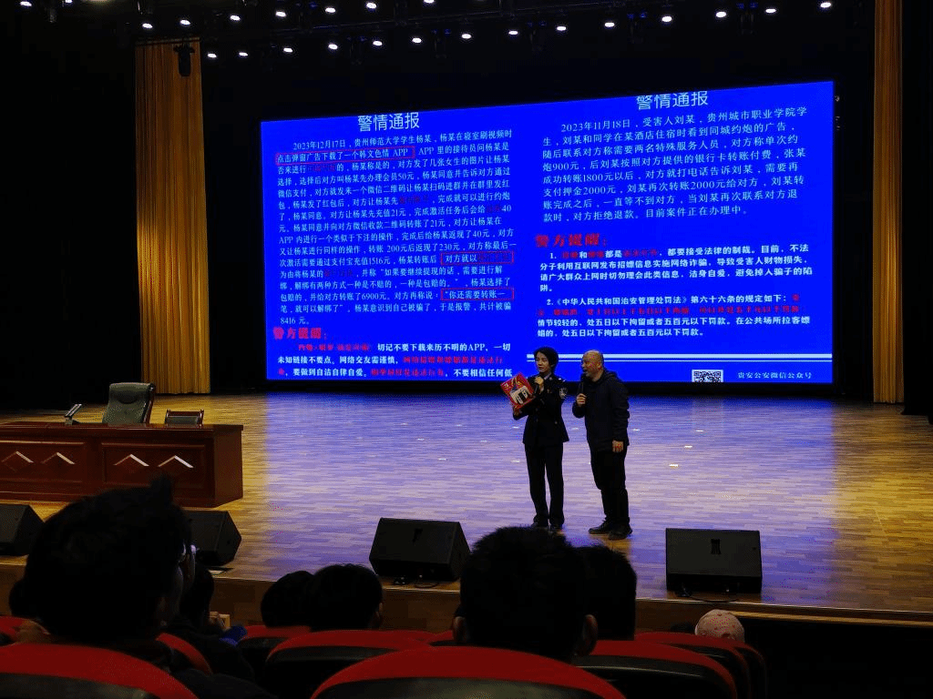 为进一步提升学生预防诈骗能力,增强安全防范意识,营造良好学习生活环境,切实保障广大师生利益,维护校园安全稳定。3月20日,乐游棋牌联合贵安新区公安局侦防中心开展2024年春季“防范电信诈骗安全主题教育”讲座,二级学院党总支书记(副书记),学生科科长(副科长)、辅导员及安全志愿者、反诈联盟志愿者和学生代表共计1200余人参加讲座。