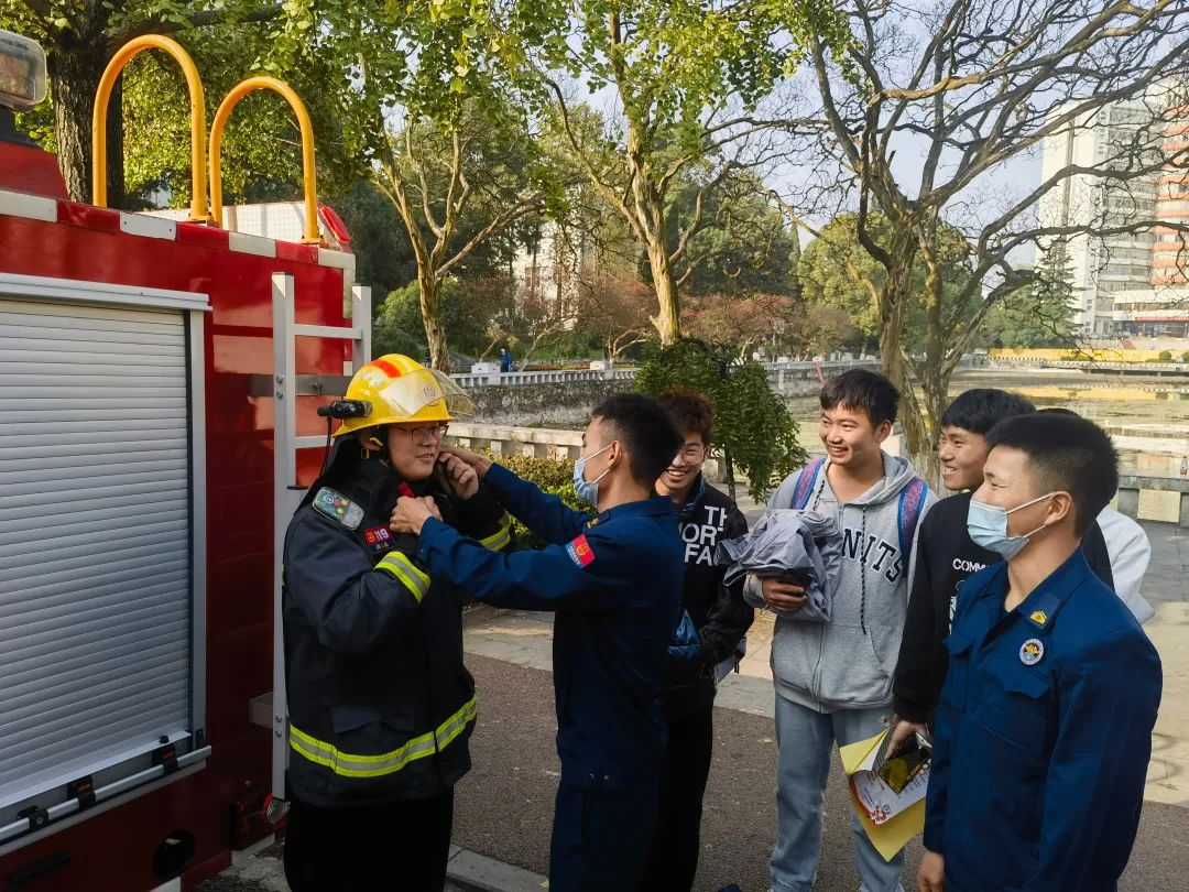 第三展区是器材展示区,同学们参观了先进的消防器材装备,并现场进行逃生面罩使用演示以及灭火器使用讲解与演示,让同学们亲身体验。