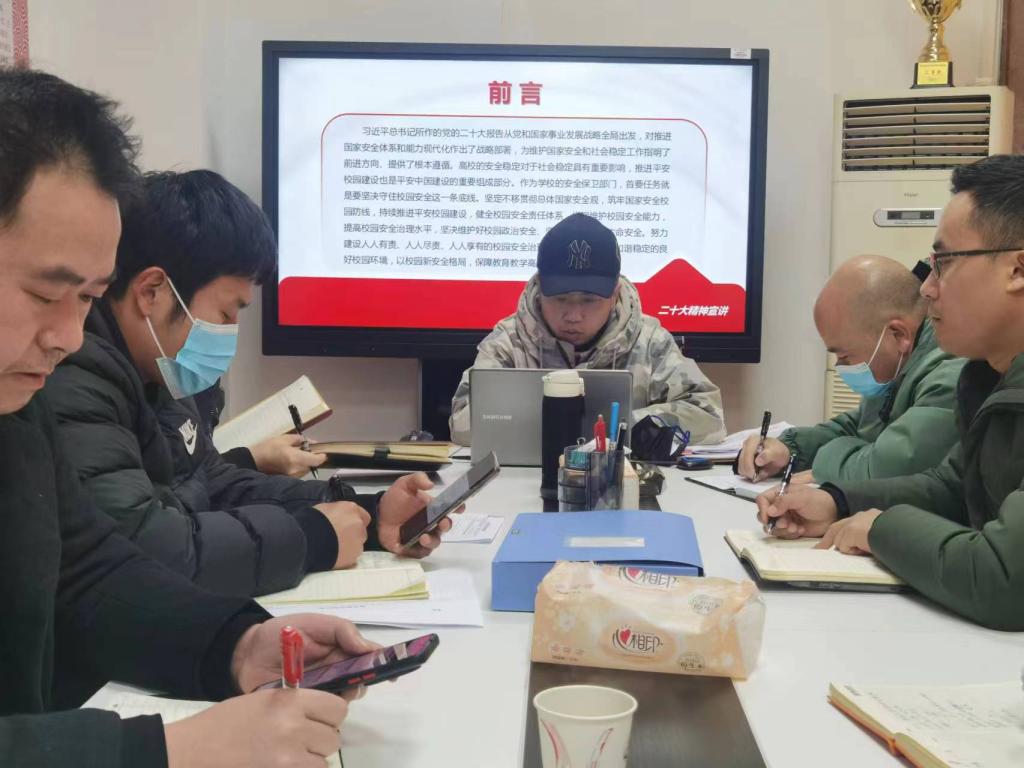 12月1日下午,保卫处党支部召开了党的二十大精神宣讲会,党支部书记程超作《建设平安校园 守护师生安宁,全力打造共建共治共享校园安全治理共同体 以校园新安全格局保障教育教学高质量发展》的宣讲报告,对贯彻党的二十大精神进行深入学习。保卫处全体人员、保安公司项目经理及驻点大队长参加。