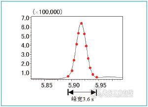 其中保留时间根据AART 功能自动计算;循环时间为配置在一个时间组中所有化合物event 事件的总和,如果设置为0.3s,则每个化合物数据采集点的时间间隔为0.3s,要保证良好的重现性,一般每个峰必须保证多于10 个数据采集点。固定循环时间可以保证足够多的数据采集点,从而有利于获得良好的峰面积重现性。如图3 所示,峰宽3.6 s,固定循环时间0.3 s,则可以采集12 个点,从而保证良好的峰面积重现性。如上所述,以往手动操作需要耗费近5 小时的方法开发工作,分析正构烷烃后,使用Smart MRM 功能仅需5 分钟即可完成,实现了方法建立最大程度的自动化。