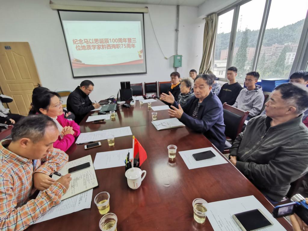 座谈会上,廖莉萍秘书长回顾了在国难当头、中华民族遭受屈辱的时期,三位地质学家不顾个人安危,全身心投入科学救国,献身地质的人生经历。刘幼平院长以三位地质学家为地质科学献身的事迹为例,向师生们解读了科学家精神的实质、内涵,勉励青年学子要以地质先烈为榜样,发扬科学家精神。马以思的姨侄子杨伯英先生讲述了青年马以思立志为国、为地质科学奉献一生的感人故事。吴维义书记以此纪念活动作为对师生爱国主义教育的契机,以三位地质学家鲜活的例子,现场开展了“不忘初心,牢记使命”主题教育。交流结束,地质学会向理工学院赠送了《黔西审匪记》、《近代地学在贵州》及《贵州三叠纪科普文选》等有关资料。马以思亲属向师生赠送了亲属家人整理的《马以思诞辰100周年(1019-2019》纪念)》文集。