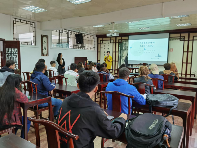 讲座以唐宋八大家韩愈、柳宗元、欧阳修、苏洵、苏轼、苏辙、王安石和曾巩的生平和代表作为主线,何果教授与国际学生们分享了唐宋八大家在诗词创作上的小故事,同时对其代表作进行了深入细致的分析。