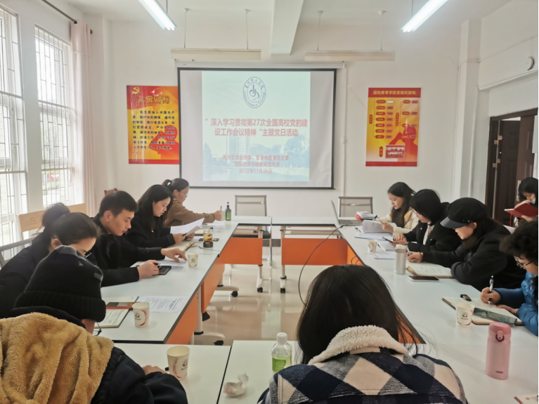 按照学校党委要求,国际教育学院教师党支部与机关党委宣传部、党委统战部党支部开展结对共建。两个支部于2021年11月28日在蔡家关校区第四教学楼101室共同开展了“深入学习贯彻第27次全国高校党的建设工作会议精神”主题党日活动。