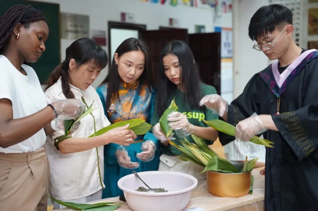 正逢端午佳节,为丰富校园文化生活,欢送2023届国际学历生,以及充分展现中国传统文化的独特魅力,继承和弘扬端午节的习俗与文化,国际教育学院于6月21日在第四教学楼大厅举办了毕业派对暨端午节文化体验活动。贵州理工学院副院长林长松、后勤管理处、经济管理学院、食品药品制造工程学院、土木工程学院等相关负责人和国际教育学院全体教师出席了此次活动。活动由国际教育学院副院长徐丽丹主持。