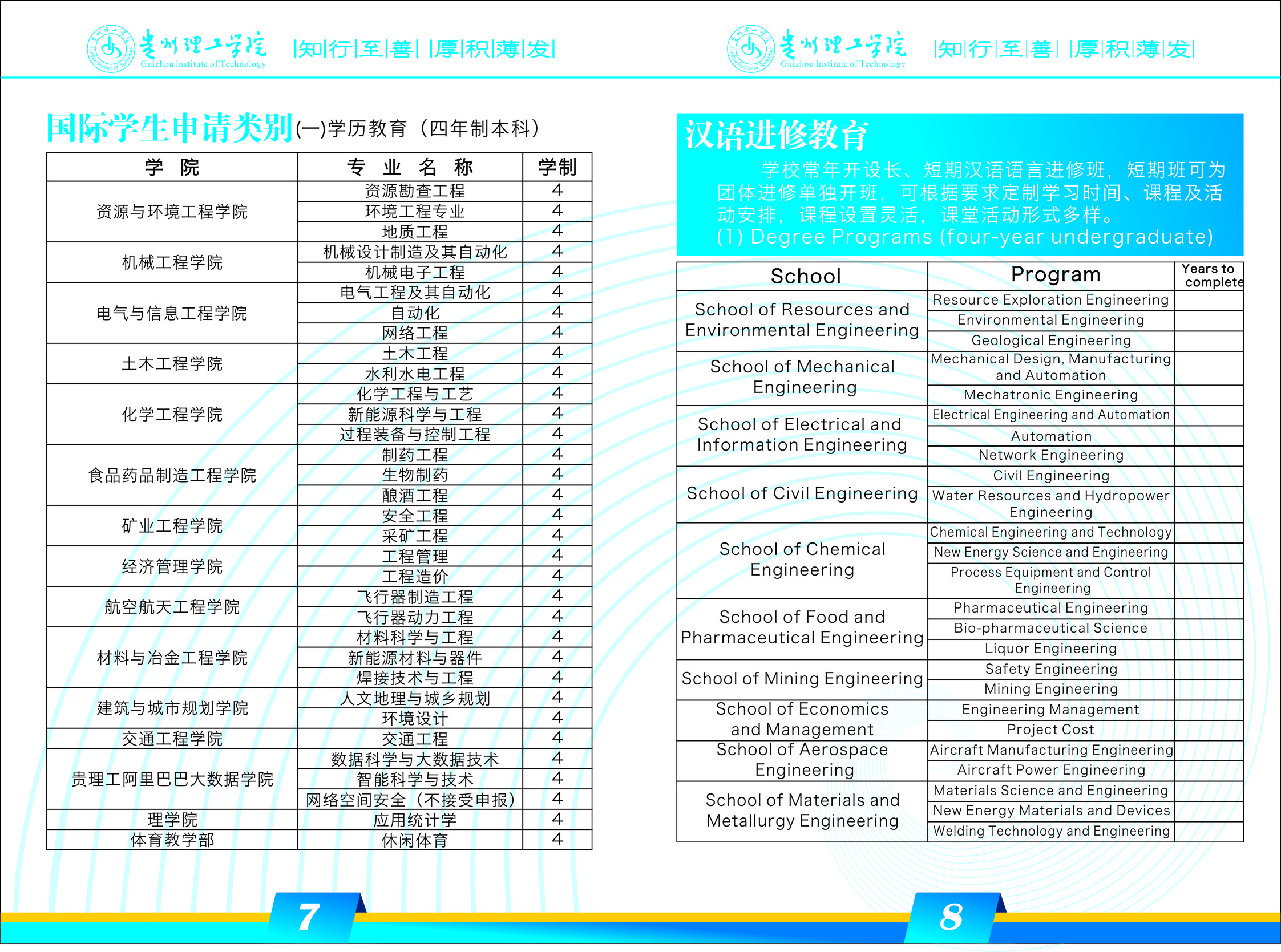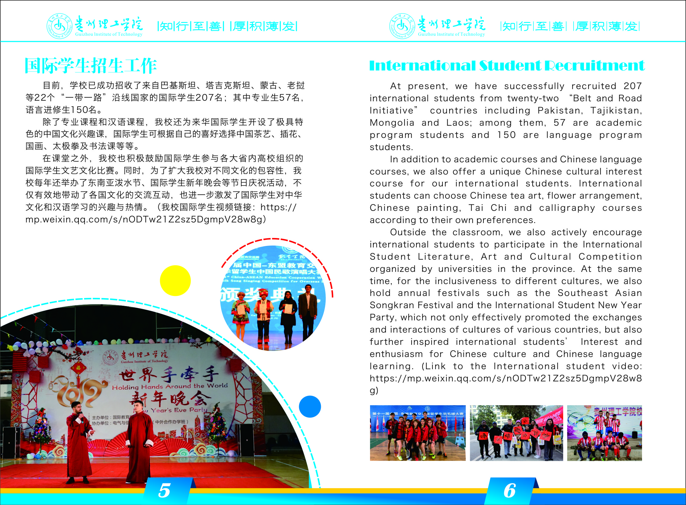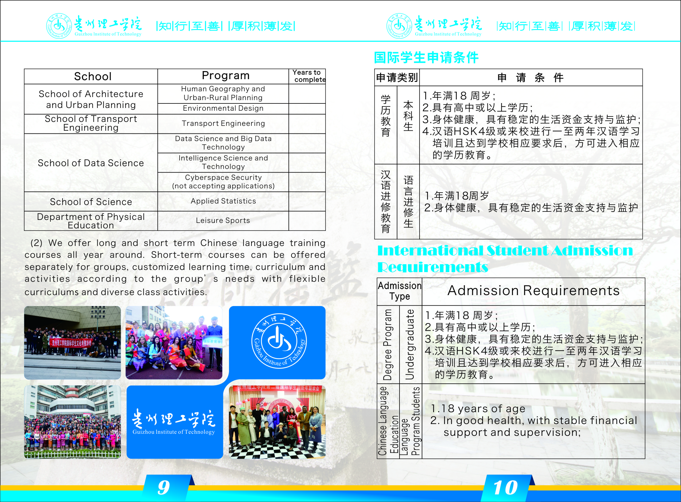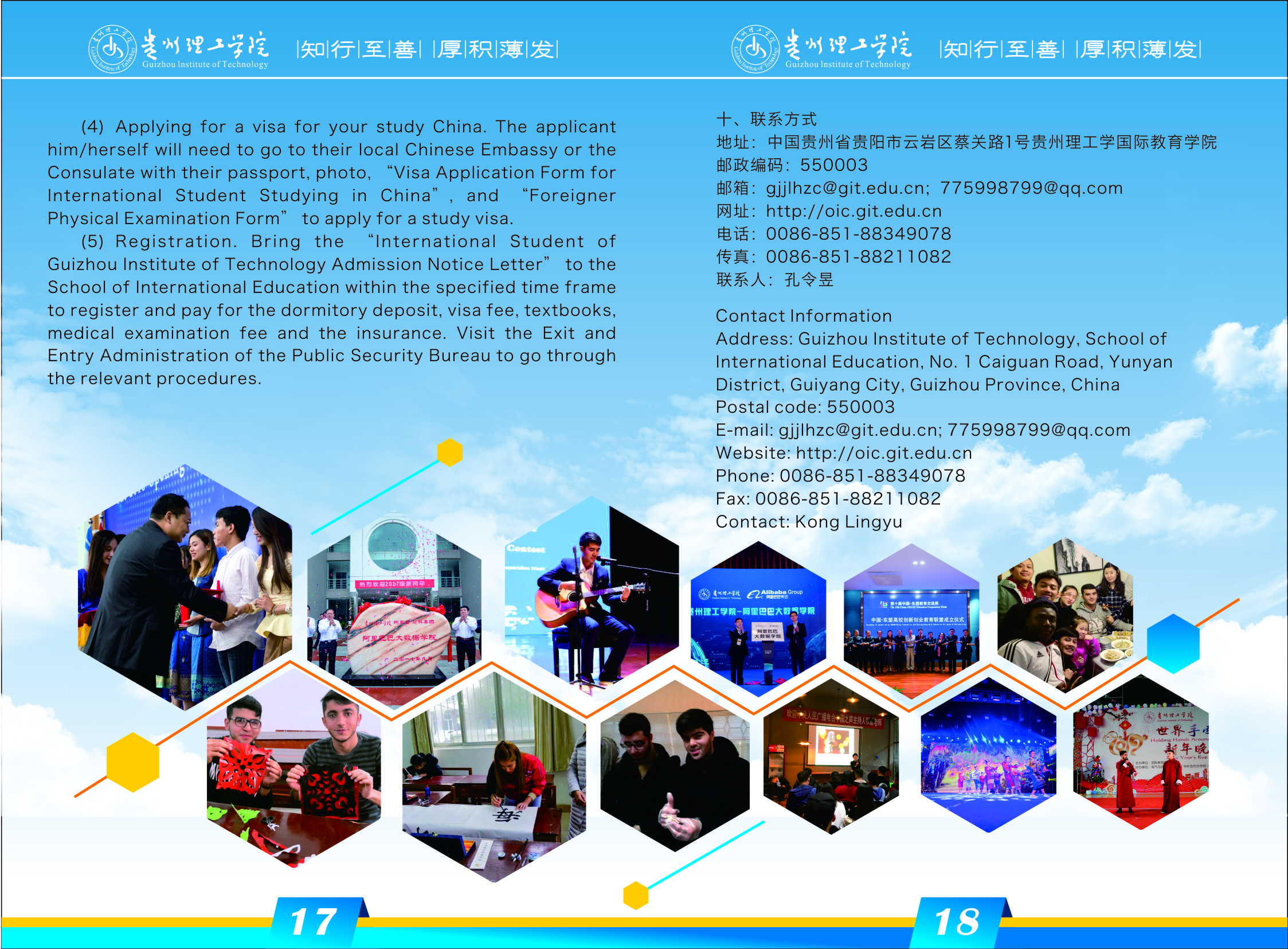 (5)Registration. Bring the “International Student of Guizhou Institute of Technology Admission Notice Letter” to the School of International Education within the specified time frame to register and pay for the dormitory deposit, visa fee, textbooks, medical examination fee and the insurance. Visit the Exit and Entry Administration of the Public Security Bureau to go through the relevant procedures.