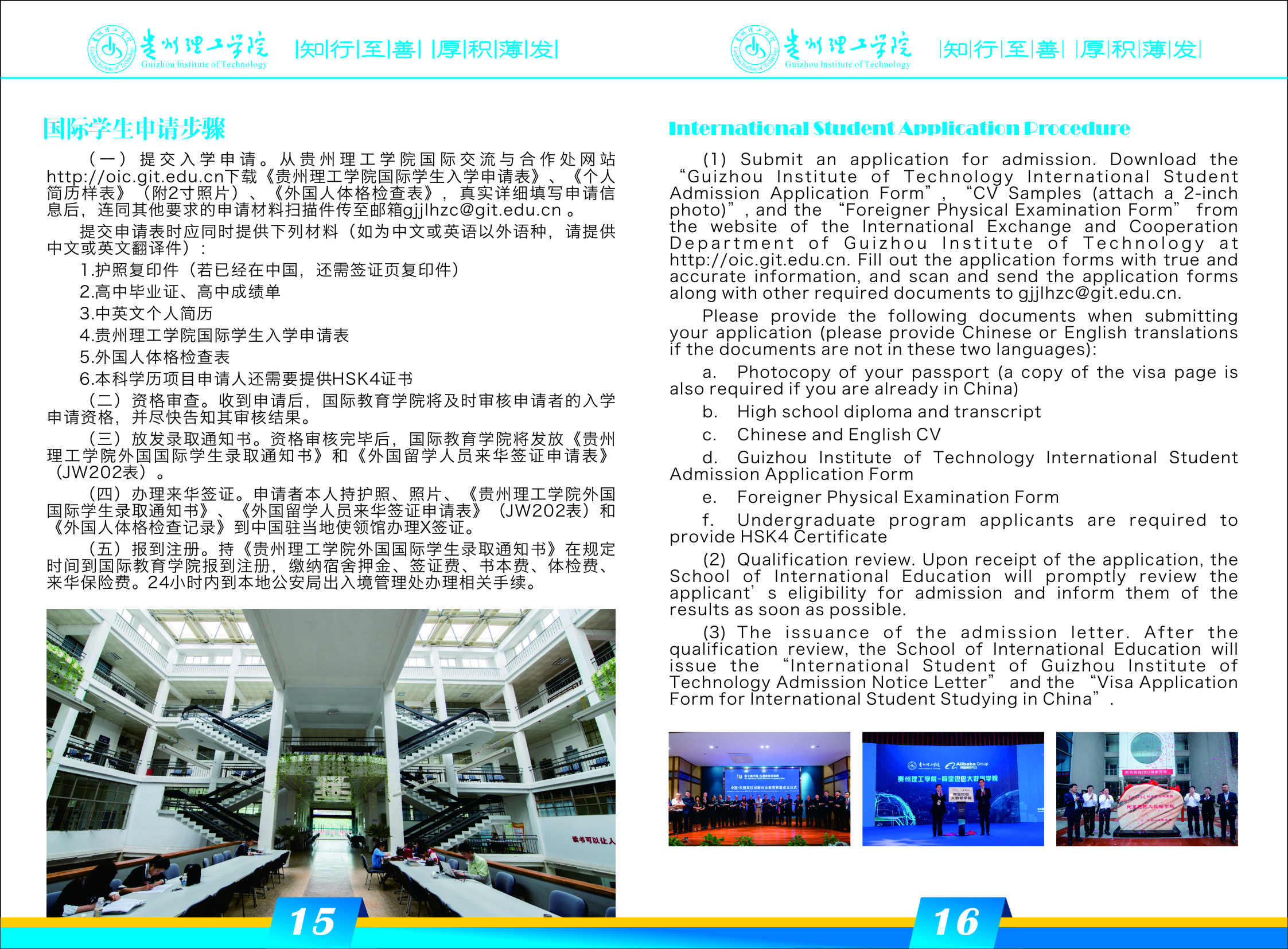 (1) Submit an application for admission. Download the “Guizhou Institute of Technology International Student Admission Application Form”, “CV Samples (attach a 2-inch photo)”, and the “Foreigner Physical Examination Form” from the website of the International Exchange and Cooperation Department of Guizhou Institute of Technology at http://oic.git.edu.cn. Fill out the application forms with true and accurate information, and scan and send the application forms along with other required documents to gjjlhzc@git.edu.cn.
