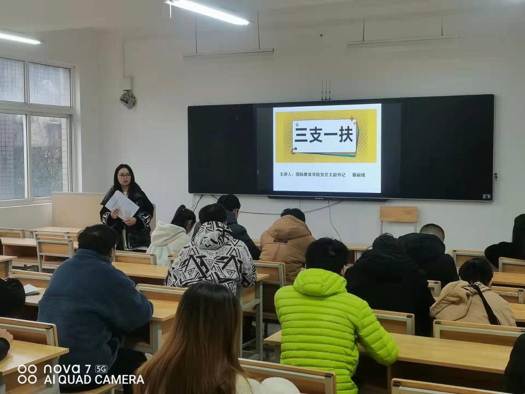 为深入贯彻党中央、国务院稳就业工作部署和要求,鼓励更多的应届高校毕业生报名参与志愿服务、投身基层,2021年12月16日,国际教育学院党总支副书记章丽娥在四教215为18、19、20级学生开展了三支一扶计划讲座。