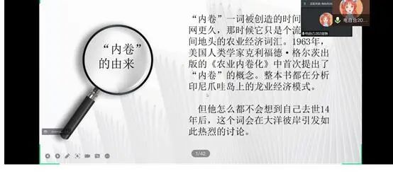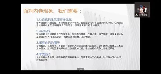 大讲堂由学检部马瑞同学主持,贾艳 、吴婷婷 、叶恒源、黄纯寅作为主讲人,同学们通过视频、图片、ppt的方式,结合自身经历就“内卷的弊端”分享了他们的意见与看法。大家一致认为,对于“内卷”现象,应当保持理智,拒绝“内卷”,坚持以自己的节奏与态度进行学习与生活,并与周围的同学保持良性竞争,这将更有益于自己的学习生活。