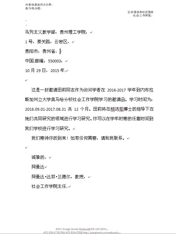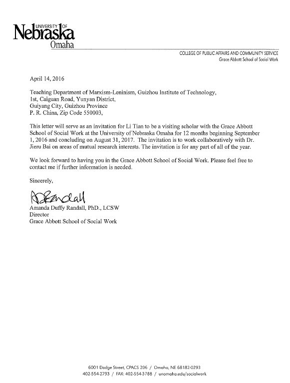 | 到内布拉斯加州立大学奥马哈分校进行访问学习