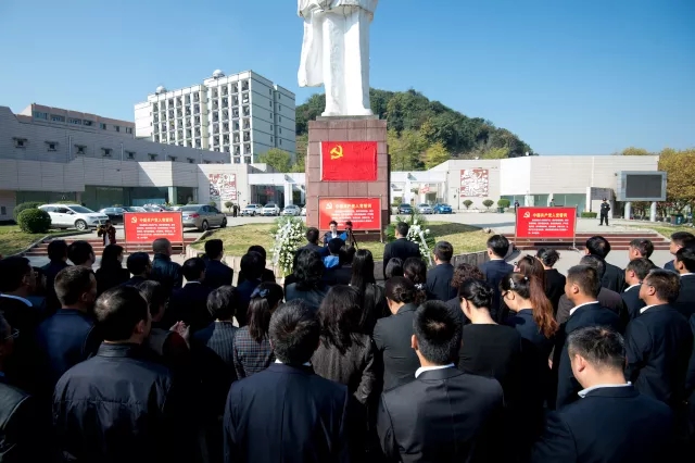 在毛主席塑像前,鲜红的中国共产党党旗在阳光下格外庄严。面对党旗,党员高举右手,庄严宣誓:“我志愿加入中国共产党,拥护党的纲领,遵守党的章程……”铿锵有力的宣誓声响彻空中,激昂洪亮的12句入党誓词传达出身为中共党员的神圣感和自豪感,让现场党员深刻感受到肩上的责任和使命。
