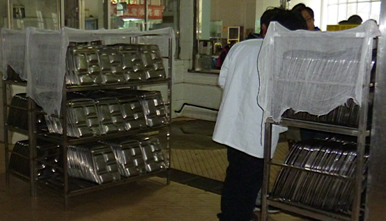 各个食堂的后厨从操作间布局到内外环境卫生上都做的非常好,每天都有专人进行卫生巡视与清扫,随时保证桌面干净,地面整洁无污物、痰迹、积水、杂物,打饭窗口、玻璃墙壁干净无尘土。后厨操作间均实行“专一”制,无论是后厨空间较大的一食堂还是空间稍小的二、三食堂,都能做到从白案(就是俗称的面点房)、红案(就是肉类品的加工制作间)到凉菜间,从原料清洗到餐饮具的消毒全部分区处理专人负责。