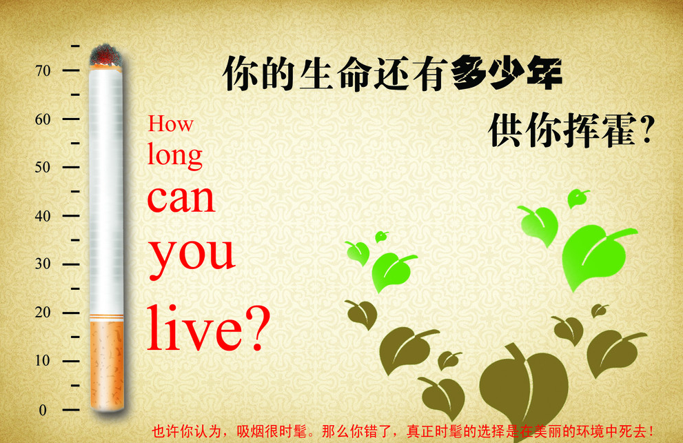 (摘自互联网) 自20世纪50年代以来,全球范围内已有大量流行病学研究证实,吸烟是导致肺癌的首要危险因素。为了引起国际社会对烟草危害人类健康的重视,世界卫生组织1987年11月建议将每年的4月7日定为“世界无烟日(World No-Tobacco Day)”,并于1988年开始执行。自1989年起,世界无烟日改为每年的5月31日。2015年5月31日是第28个世界无烟日。