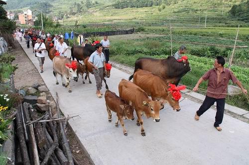 秋分随之即到,其时便出现挨家送秋牛图的。其图是把二开红纸或黄纸印上全年农历节气,还要印上农夫耕田图样,名曰"秋牛图"。送图者都是些民间善言唱者,主要说些秋耕和吉祥不违农时的话,每到一家更是即景生情,见啥说啥,说得主人乐而给钱为止。言词虽随口而出,却句句有韵动听。俗称"说秋",说秋人便叫"秋官"。