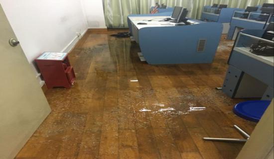 21时许,后勤管理处物管科接到大学外语教学部语言实验中心紧急报修电话称:大外部语言实验中心501教室下水管道爆裂,冰雹夹杂雨水直接倒灌进入教室,情况万分危机,请求帮助!“灾情就是命令”!接到报修电话后,物管科即刻协调组织,调派人手,赶往现场进行施救。