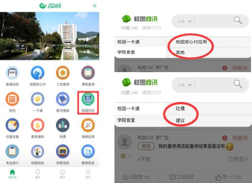 该平台通过易班、微哨及微信三个窗口进行运作,利用信息的便捷性高效性,将食堂食品安全的问题及时进行反映,可杜绝反映滞后的弊端。以下以微哨平台为例,通过微哨平台中校园问讯窗口可以吐槽,可以建议,可以对校园安心付应用功能提出需求。