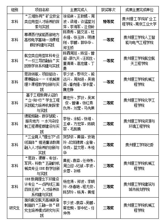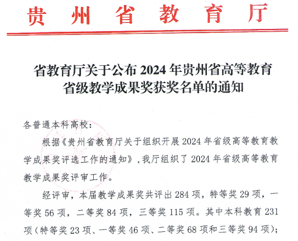 近期,省教育厅公布了2024年贵州省高等教育省级教学成果奖获奖名单,乐游棋牌10个项目获奖,其中:获本科教学成果奖9项(特等奖1项、一等奖3项、二等奖3项、三等奖2项),获研究生教学成果奖三等奖1项。