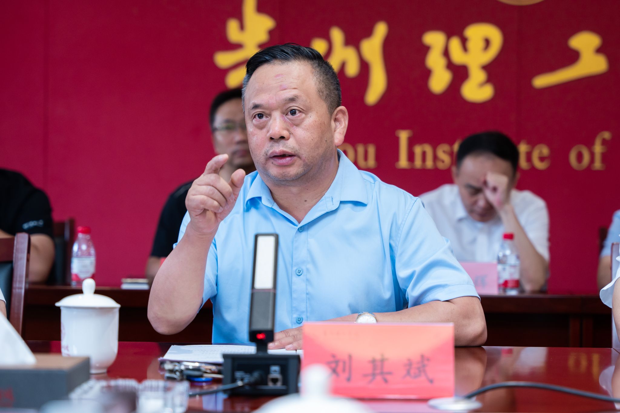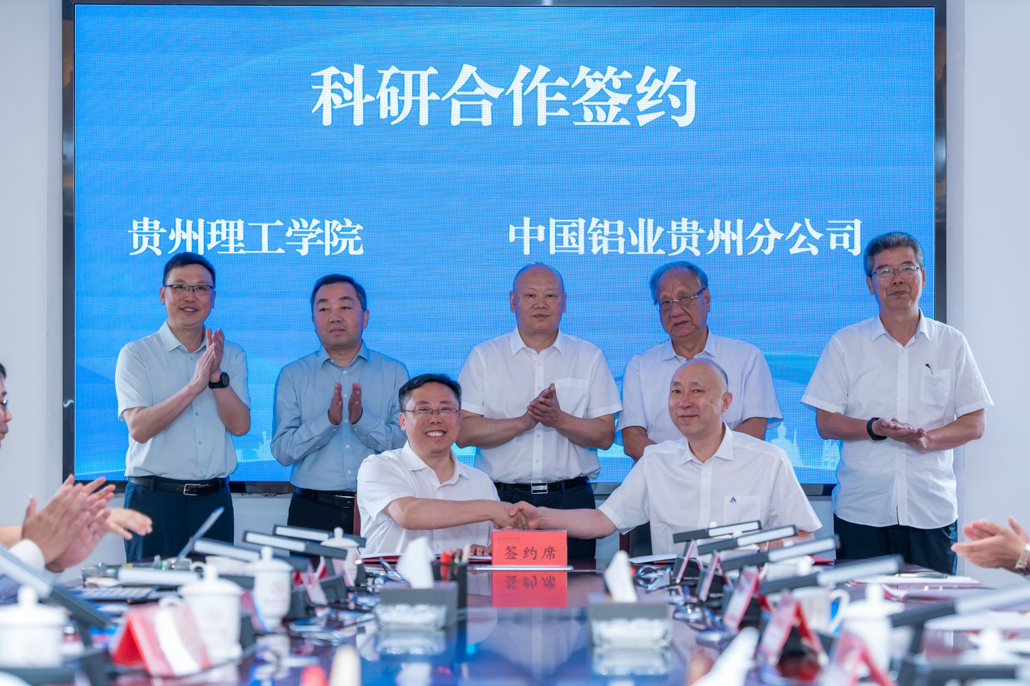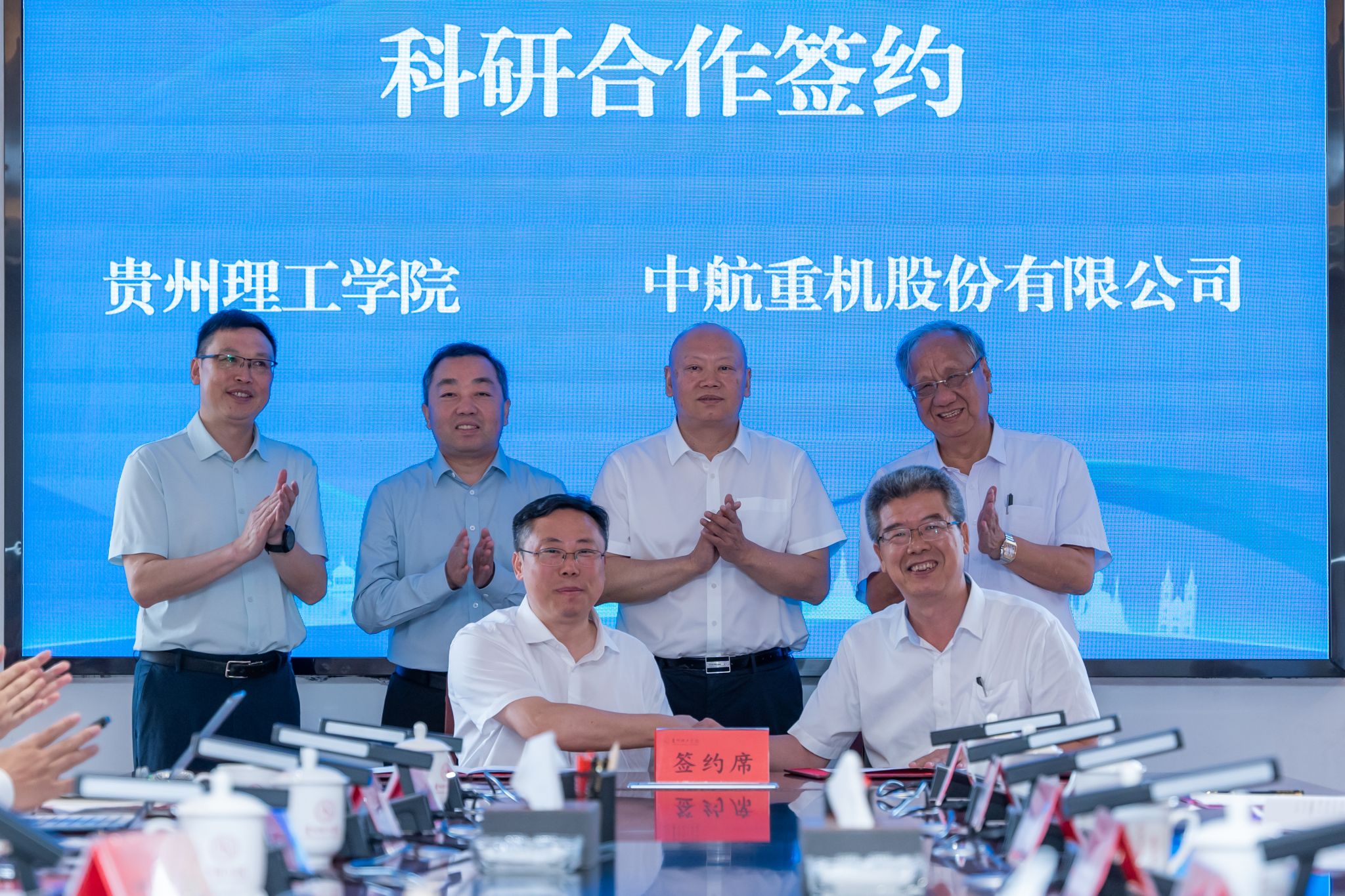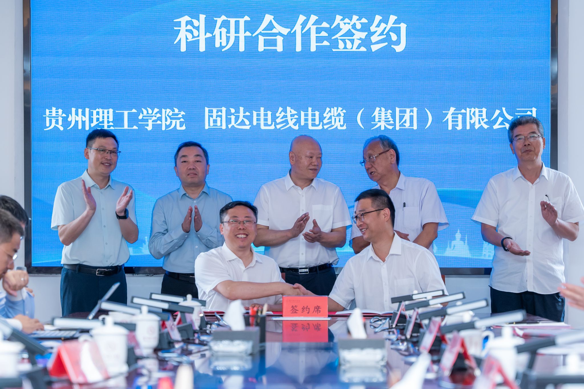 贵州理工学院副院长李少波与中航重机股份有限公司副总经理冀胜利、中国铝业贵州分公司副总经理胡冬阳、固达电线电缆(集团)有限公司副总经理黄鑫,就科研项目合作进行签约。