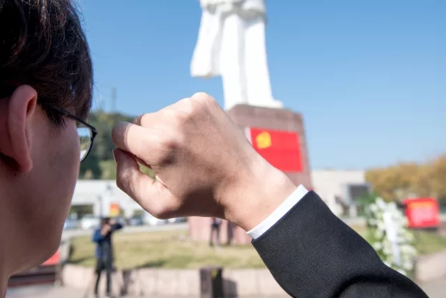 在毛主席塑像前,鲜红的中国共产党党旗在阳光下格外庄严。面对党旗,党员高举右手,庄严宣誓:“我志愿加入中国共产党,拥护党的纲领,遵守党的章程……”铿锵有力的宣誓声响彻空中,激昂洪亮的12句入党誓词传达出身为中共党员的神圣感和自豪感,让现场党员深刻感受到肩上的责任和使命。