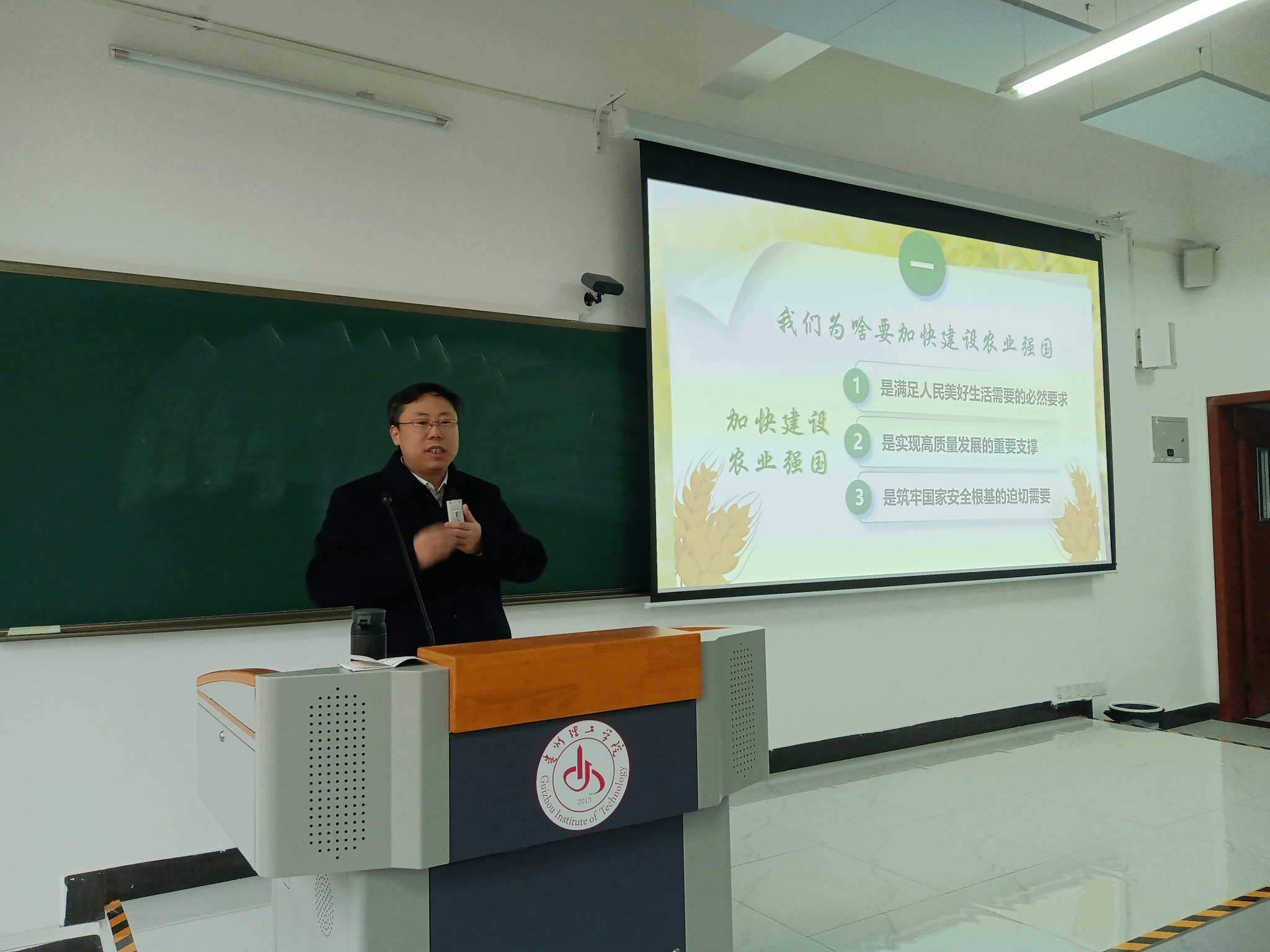 11月28日上午,副院长黄名正以“阔步迈向农业强国”为题,为建筑251、环设251班同学专题授课。他围绕“农业强国建设的战略意义与实践路径”,引入贵州农业发展案例,重点讲述了农业在保障粮食安全、促进共同富裕等方面的重要作用。他强调建筑与环境设计在农业强国建设中大有可为,不仅能够参与乡村建设,更能在农业景观设计、乡土建筑保护、生态人居环境构建等方面发挥作用。他鼓励同学们积极投身乡村振兴实践,将个人成长融入国家发展大局,在农业强国建设实践中把握发展机遇,贡献青春智慧。