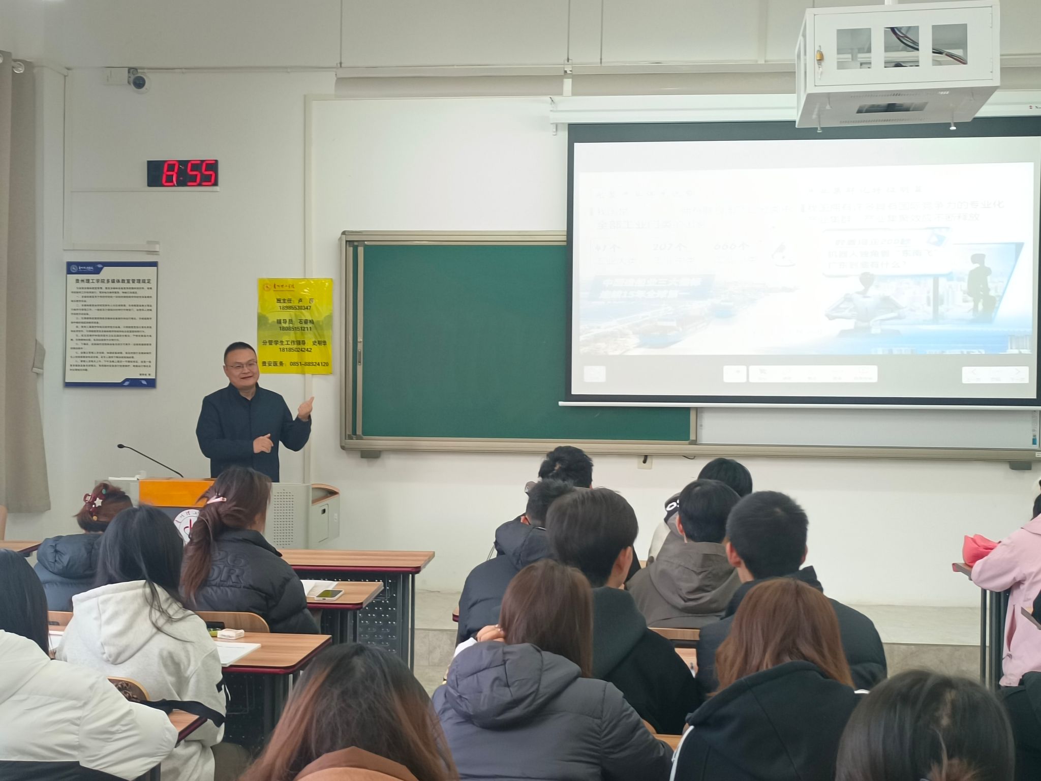11月26日,副院长杨鹏以“正确认识中国经济热点问题”为题,为英语231、232班学生专题授课。他以党的二十届四中全会精神为切入点,围绕“应对外部冲击的能力底气何来”“为何要促进民营经济发展壮大”“做强国内大循环如何实现”三个方面展开讲解,系统解读了中国经济的发展态势与政策导向。他指出,贵州作为西部重要省份,正积极抢抓国家战略机遇,推动高质量发展,成为中国经济稳健前行的重要缩影,他结合贵州省近年来在产业发展、数字经济、乡村振兴等方面取得的成就进行分析,生动展现了地方经济融入国家发展大局的实践路径。