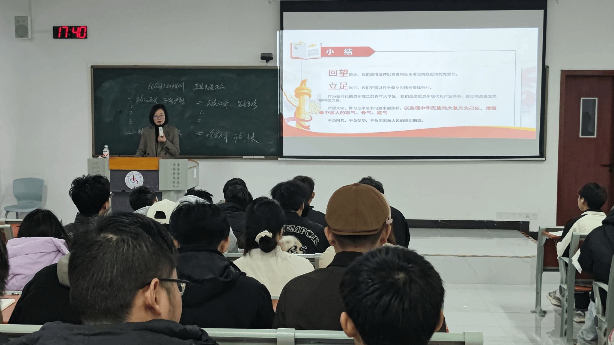 11月18日,校党委常委、纪委书记、监察专员赵芳以“纪念抗战胜利 坚定民族信念”为题,为飞制231、232班学生专题授课。他带领同学们重温“9.3”抗战大阅兵,回顾中国人民艰难曲折的14年抗日战争历史,授课围绕“铭记历史正义必胜、民族壮举浓墨重彩、精神丰碑永不磨灭、珍爱和平开创未来”等四个方面展开。她强调中国共产党是全民族团结抗战的中流砥柱,伟大抗战精神,是中国人民弥足珍贵的精神财富。她号召同学们要以史为鉴、开创未来,努力学好专业知识,传承航天精神,厚植家国情怀,立航空航天报国之志,鼓励同学们以先辈为标杆,勤学实干、勇探未知,确保红色江山后继有人、代代相传,努力在新时代新征程上赢得更加伟大的胜利和荣光。