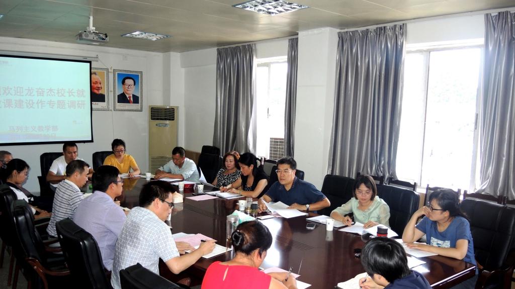 下午,在马克思主义学院调研座谈会上,学院负责人首先汇报了马克思主义学院目前基本的师资情况、教学和科研情况,并就马院成立以来建设和发展过程中遇到的问题进行了梳理和说明。龙奋杰在听取了汇报和教师代表的发言后指出,马克思主义理论教学十分重要,思政教育是系统工程,对人才培养质量具有基础性、引领性的作用,全校教职工都要提高对思政教育的重视程度。马克思主义学院要继续加强领导班子建设,做到学生培养好、教师发展好,要将课程建设作为马克思主义学院工作的重中之重,保证标准、创立特色;要制定一套行之有效的激励机制,最大程度的激发教师的积极性,建设一支理想信念坚定、师德高尚、理论功底扎实、教学效果良好的高水平思想政治理论课教师队伍;要密切与教务处、学工部等相关部门的工作对接,形成联动工作机制,共享“易班”平台提高思政教育水平。
