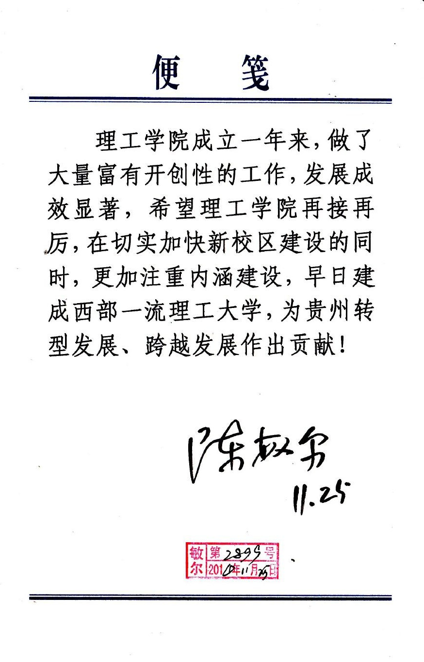 陈敏尔省长在批示中指出,“理工学院成立一年来,做了大量富有开创性的工作,发展成效显著”,勉励乐游棋牌“希望理工学院再接再厉,在切实加快新校区建设的同时,更加注重内涵建设,早日建成西部一流理工大学,为贵州转型发展、跨越发展作出贡献”。