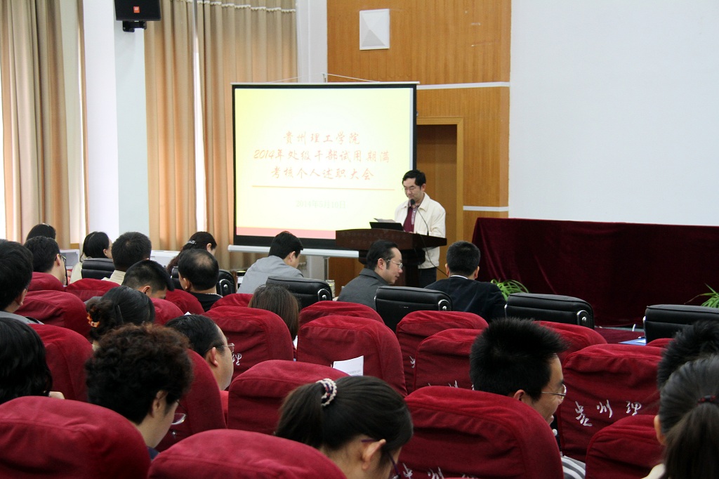 本网讯(和风) 5月10日,贵州理工学院2014年处级干部试用期满考核个人述职大会在喀斯特楼三楼报告厅举行,53名处级干部对一年来的履职情况进行了汇报。全体在家乐游棋牌出席述职大会。
