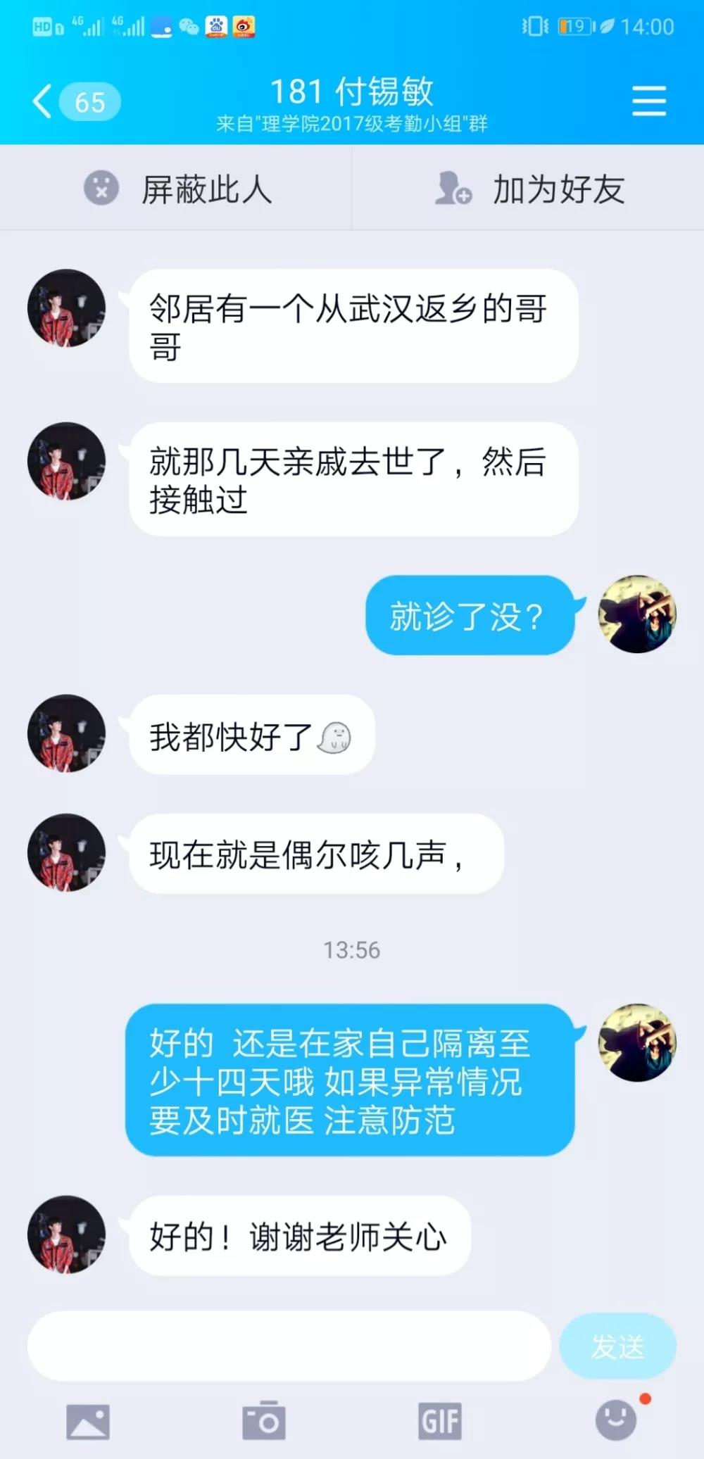 “今身体情况咋样,有没有感冒咳嗽”“假期不要乱跑,好好呆在家里就是为疫情防控出自己的一份力了”“不信谣,不传谣,注意个人卫生”等等,这些话从腊月二十九开始就成为了矿业工程学院年轻辅导员刘芳诚每天工作的一部分。自新冠疫情爆发以来,所负责班级和年级学生的身体状况、出行情况、有无密切接触史等信息成为了他最关心的事。对于有咳嗽发烧症状的学生,提醒其注意休息,有必要时及时就医;对于有出行信息的学生,告知其出行时注意自身卫生,到达目的地时要严格执行居家隔离;对于与湖北有密切接触的学生,安慰他们不要紧张,配合当地居委会做好体温检测,提高自身免疫力;针对外出打工的学生,除了告知其注意谨防上当受骗外,还会提醒他们注意劳逸结合;对于湖北籍的同学,除了本人的身体状况,其家人的身体状况也成为了他日常的牵挂,每天微信、QQ里同学们一句句的“无异常”成为了他心中的安慰剂。贵州山区众多,过年期间又逢雨雪,导致部分地区电网中断,还有部分学生出现手机遗失等情况,刘老师通过积极联系家长等方式了解到学生日常的基本状况。在这场疫情中,作为辅导员和班主任的刘老师认为,他更多扮演的是“大管家”角色,只有把学生的基本信息盘点好,才能规划,安排好学生的学习生活。