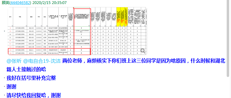 期间她因生病住院做一个小手术,在做完手术的第二天她仍坚持准时坐到电脑前继续学生疫情信息排查工作,由于要报送统计全院1291名学生的疫情信息,她熬夜加班到凌晨2点,反反复复核对和修正相关数据,确保上报的数据少出错、不出错。她自己所带的自动化181有一位铜仁籍的同学因家里网络不畅,未及时看到班级群班主任通知的不准提前返校的通知,这位同学因在贵阳兼职提前回到了学校。顾英老师知道后,第一时间打电话和该生沟通,及时疏导劝解。为确保安全,该生当天即刻购买了返乡车票,因之前了解到该生是单亲家庭,家庭经济比较困难,顾英老师立马通过QQ转了200块钱的红包给该生, 让该生回到家后发地址定位给她,确保该生安全到家后,她才松了一口气。