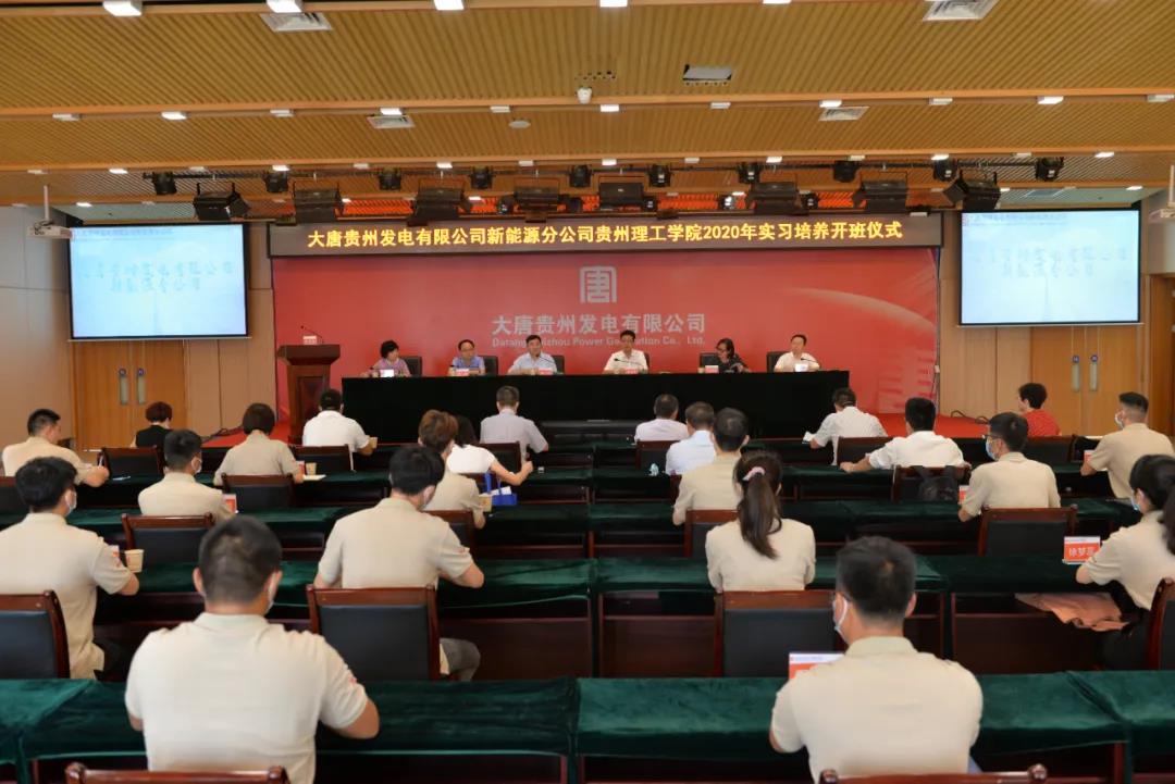 本网讯(人工智能与电气工程学院 刘帆/文图)8月13日下午,贵州理工学院与大唐贵州发电有限公司新能源分公司2020年实习培养开班仪式在大唐贵州发电有限公司举行。校党委书记曾羽,大唐贵州发电有限公司总经理刘建祥、副总经理韩旭东、新能源分公司总经理王昭力出席开班仪式,学校教务处、人工智能与电气工程学院、大数据学院相关负责人,2020年“大唐定制班”学生参加了此次活动。