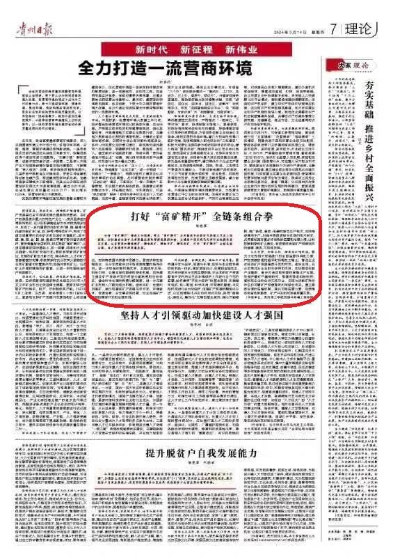 全省“富矿精开”推进大会强调,要以“富矿精开”为关键抓手在新时代西部大开发上闯新路,加快推动全省矿业高质量发展取得新进展新突破,为推进中国式现代化贵州实践提供坚实支撑。全省要紧扣精确探矿、精准配矿、精细开矿、精深用矿,打好“富矿精开”全链条组合拳,奋力助推贵州高质量发展。
