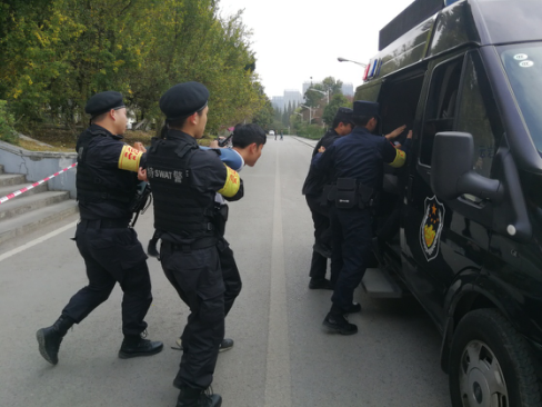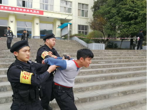 当天中午11时,2名手执砍刀的“暴恐分子”在乐游棋牌采矿楼至第二教学楼路段伺机作案,被治安三号岗值守人员发现,及时向保卫处报告。保卫处人员闻讯后,迅速调集校园应急处置队员携带安保装备,赶赴现场进行处置。到达现场后,保安队员成功将2名“暴恐分子”控制在第二教学楼门前。经过十余分钟的搏斗,成功将2人制服,随后交辖区派出所民警带走。