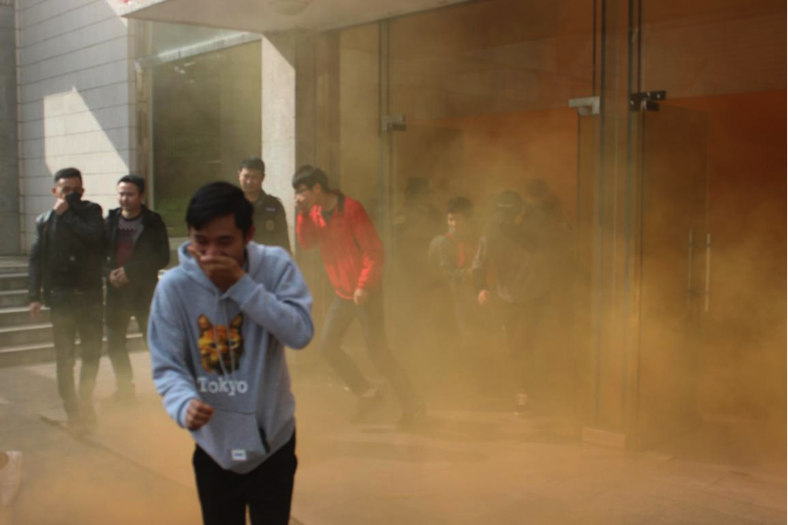 消防逃生演练使同学们了解了在大火中安全撤离的方法,锻炼了同学们面对危险的随机应变能力。