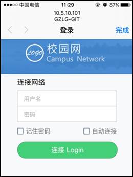 用户可根据需要选择GZLG-GIT或GZLG-GIT-Students连接无线网络,由于需要连接认证服务器和对手机登录历史进行核对,需等待一定时间,时间长短由所处位置的信号强度和移动终端系统的个体差异决定,正确连接无线网络后,终端设备可自动弹出如下所示认证界面:
