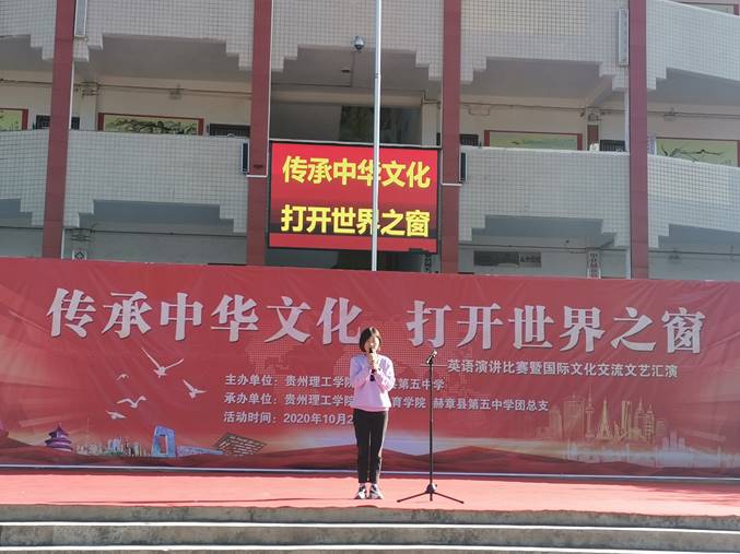 本网讯(国际教育学院 黎娟)为进一步落实2020年“一总支一项目”工作,经过前期沟通和准备,国际教育学院党总支充分发挥自身特色和优势,于10月22日继续走进赫章县第五中学,开展“传承中华文化,打开世界之窗——英语演讲比赛暨国际文化交流文艺汇演”教育扶贫活动。国际教育学院党总支书记孙凯、院长乔靖、党总支副书记杜玉红,赫章县教育局教研室教研员李伟及赫章县第五中学校长舒鹏、副校长李曦、副校长朱国强出席了此次活动。