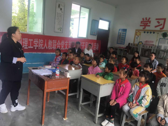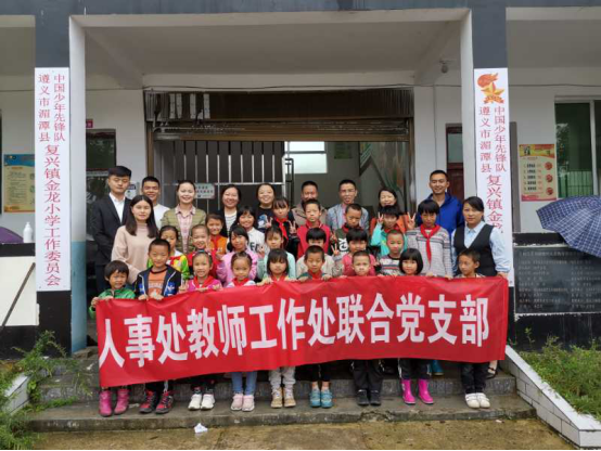 本网讯(人事处 田瑶)扶贫先扶智,扶智先通语。按照学校党委“一支部一项目”的部署要求,9月16日,适逢第23届全国推广普通话宣传周,机关人事处教师工作处联合党支部党员走进湄潭县复兴镇金龙小学,通过“推普”教育帮扶,开展脱贫攻坚工作。