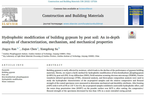 近日,土木工程材料学科领域的国际权威学术期刊《Construction and Building Materials》在线发表了贵州理工学院冉景榆教授团队在磷石膏建材化利用领域的最新研究成果(Hydrophobic modification of building gypsum by peat soil: An in-depth analysis of characterization, mechanism, and mechanical properties. Construction and Building Materials, 338 (2022) 127526)。