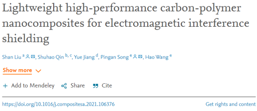 本网讯材料与能源工程学院刘珊团队在Composites Part A: Applied Science and Manufacturing上发表了题为《轻质高性能碳/聚合物纳米复合材料用于电磁屏蔽》(Lightweight high-performance carbon-polymer nanocomposites for electromagnetic interference shielding)的论文。