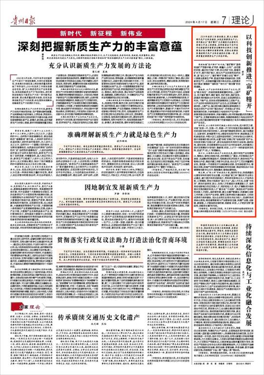 2024年政府工作报告提出,要大力推进现代化产业体系建设,加快发展新质生产力。贵州提出以“富矿精开”为关键抓手在新时代西部大开发上闯新路,是贯彻落实习近平总书记视察贵州重要讲话精神和对贵州工作重要指示批示精神的重要举措,是结合资源优势推进现代化产业体系建设的关键一招,是高质量发展新质生产力的先手棋。