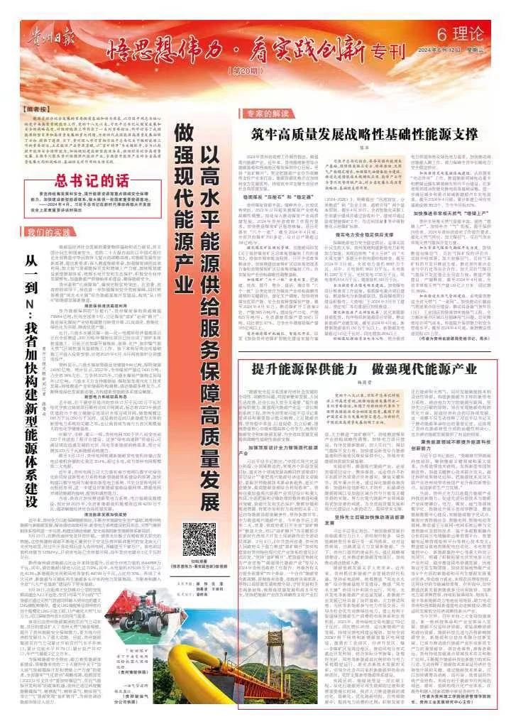 能源是经济社会发展的重要物质基础和动力源泉。以习近平同志为核心的党中央高度重视能源工作。党的十八大以来,习近平总书记从国家发展和安全的战略高度,对做好能源工作作出了一系列重要论述,科学回答了我国能源转型变革和高质量发展的重大问题,为新时代我国能源高质量发展指明了方向、提供了遵循。当下,贵州深入学习贯彻习近平总书记关于做好能源工作的重要论述,立足能源产业资源禀赋,以“富矿精开”为关键抓手,全力以赴提升能源安全保障能力,加快规划建设新型能源体系,推动经济社会高质量发展。本期专刊聚焦贵州做强现代能源产业,全面提升能源产业对全省高质量发展大局的战略性、基础性支撑作用的生动实践。