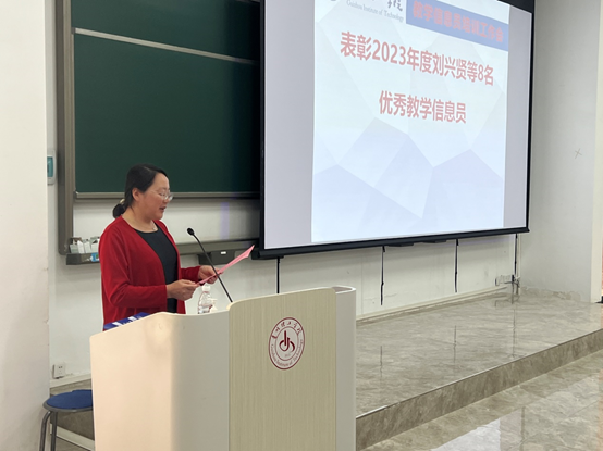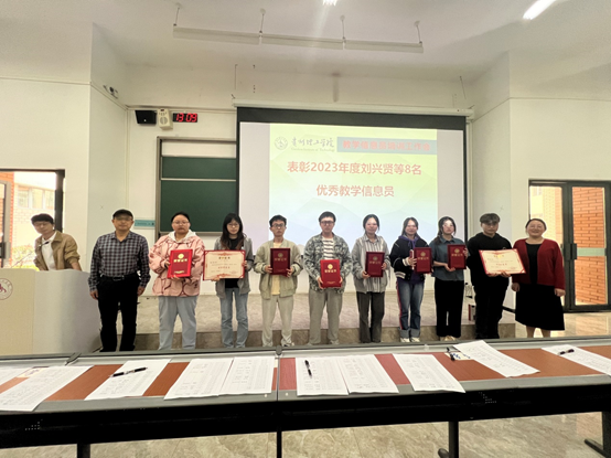 安艳玲首先对教学信息员发挥的作用给予高度肯定,对全体教学信息员过去一年的辛勤付出表示感谢,并宣读了《关于表彰2023年度优秀教学信息员的通知》的表彰文件,对受到表彰的2023年度刘兴贤等8名优秀教学信息员表示祝贺。同时指出,全校300多个班就有300余名教学信息员,你们是同学们的“传声筒”,你们的使命光荣,需要你们及时了解班上有关教学运行管理和学生学习的状况,收集并且及时反馈学生对任课教师教学态度、教学质量、教学水平等方面的意见和建议,反映教学活动中存在的教风、学风、考风问题。所以,教学信息员是一座“桥梁”,联通起学校、学院和学生,你们在为学校教学质量提升及教风学风建设做贡献,希望你们再接再厉为学校教学质量提升持续做出贡献。期间,与会领导为荣获2023年度优秀教学信息员的同学颁发荣誉证书和纪念品。