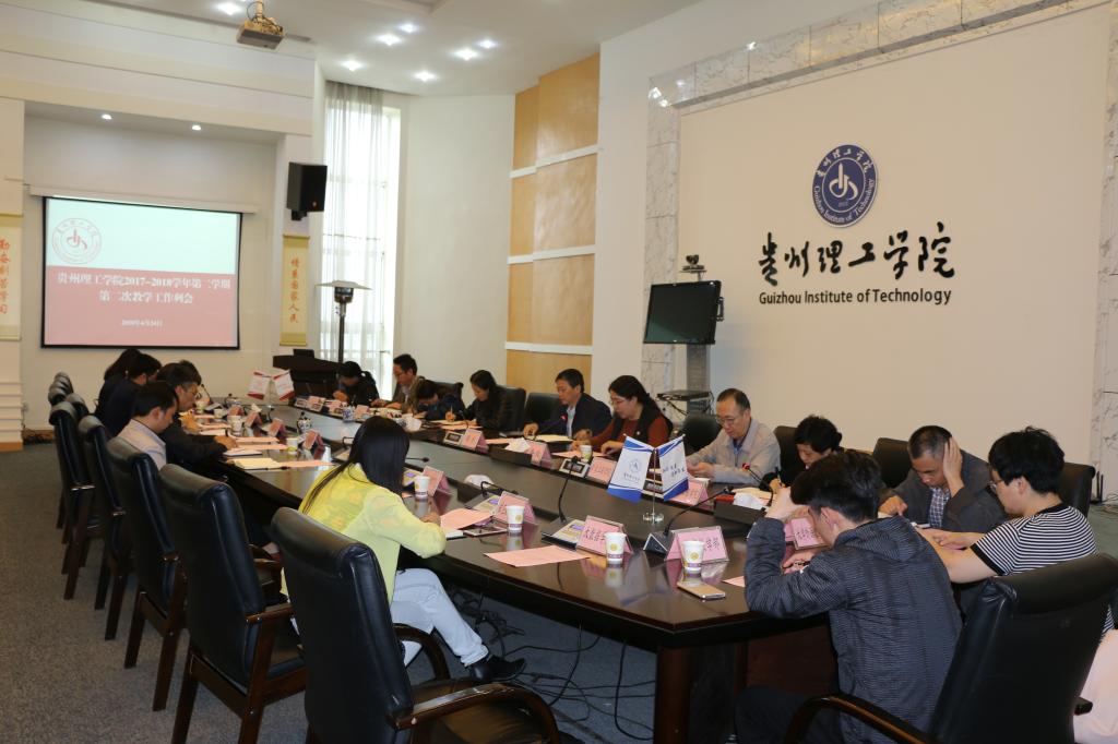 4月24日下午,贵州理工学院2017-2018学年第二学期第二次教学工作例会在喀斯特会议厅召开,副校长梁杰出席会议,各学院(教学部、中心)院长(部长、主任)、分管教学工作的副院长(副部长、副主任)、教学秘书,教务处、学生处、后勤处、创新创业中心负责人及教务处相关人员参加会议。会议由教务处处长邵芳主持。