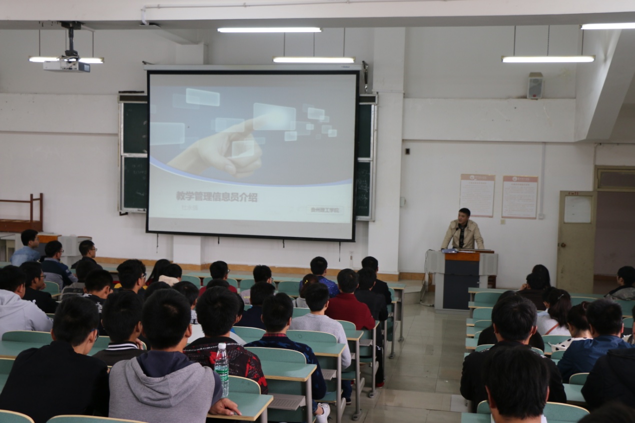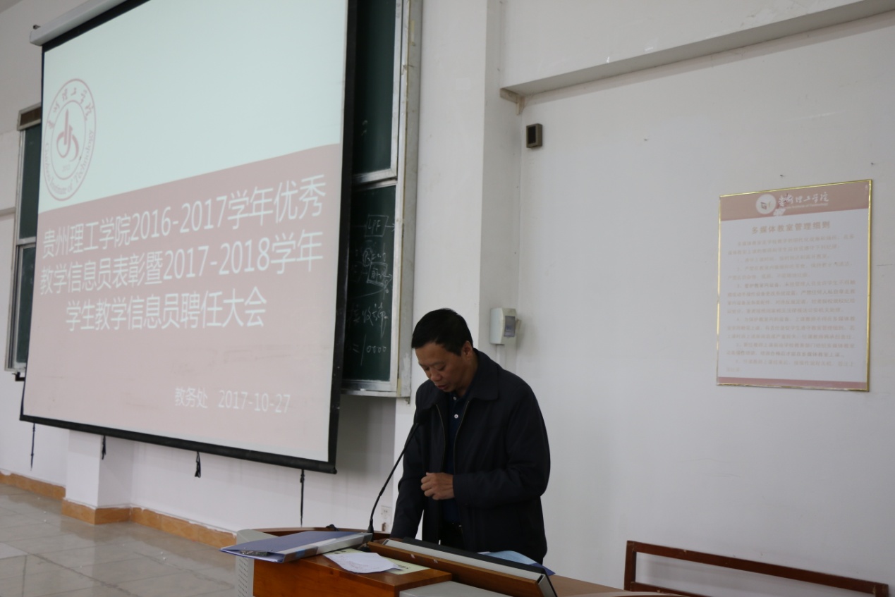 本网讯(教务处周新国)10月27日中午,贵州理工学院2016-2017学年优秀教学信息员表彰暨2017-2018学年学生教学信息员聘任大会在三教415举行。副校长梁杰出席会议并讲话,教务处处长邵芳、学工部副部长蒋文韬、教务处相关科室负责人及老师、2017-2018学年新任学生教学信息员及2016-2017学年优秀教学信息员参加了大会。会议由教务处副处长邓莲丽主持。