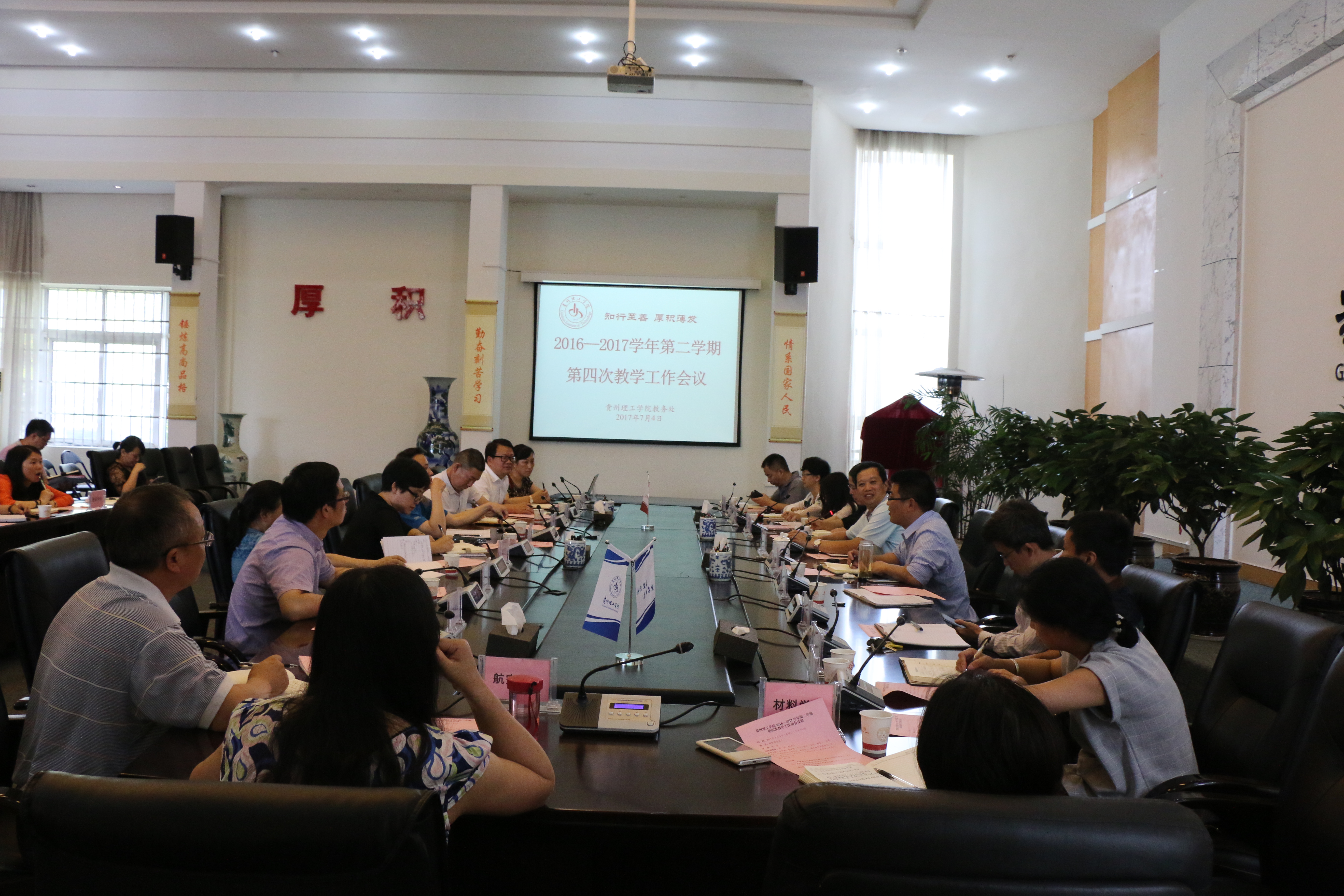 7月4日下午,教务处在喀斯特会议厅召开2016-2017学年第二学期第四次教学工作例会,梁杰副校长、张清江助理出席会议,会议由教务处处长邵芳主持,各学院、教学部(中心)院长(主任、部长)、分管教学工作的副院长(副主任、副部长)、教学秘书及教务处、后勤处、教师工作处、评估中心、创新创业中心、网络中心负责人及教务处相关人员参加会议。
