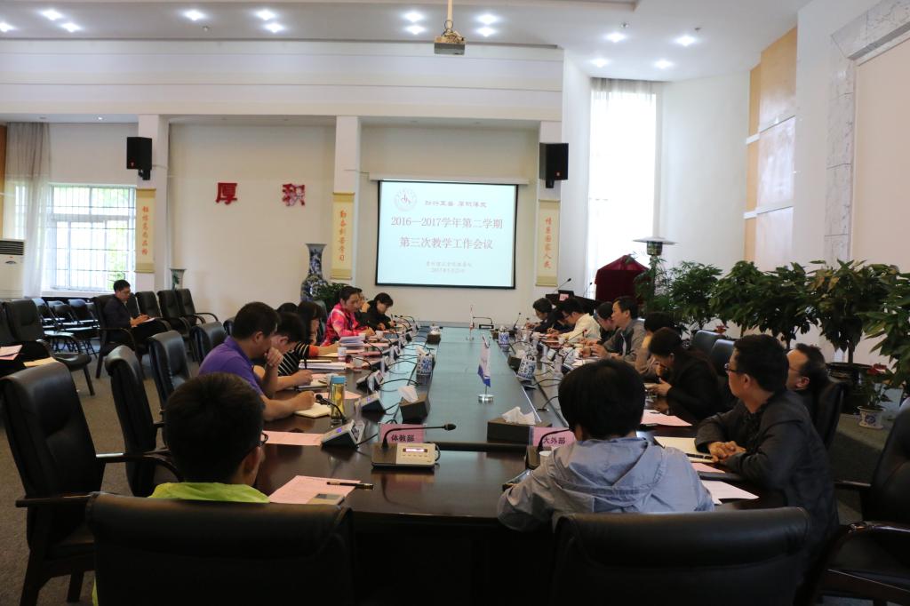 本报讯(教务处 郝飞)5月25日下午,教务处在喀斯特会议厅召开2016-2017学年第二学期第三次教学工作例会,梁杰副校长、张清江助理出席会议,会议由教务处处长邵芳主持,各学院、教学部(中心)院长(主任、部长)、分管教学工作的副院长(副主任、副部长)、教学秘书及教务处、后勤处、教师工作处、评估中心、创新创业中心、网络中心负责人及教务处相关人员参加会议。