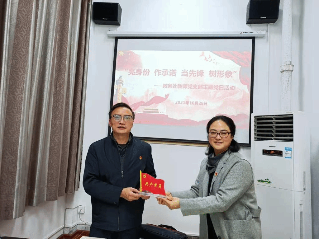 本网讯(教务处 罗敏)为进一步增强党员意识,充分发挥先锋模范作用,推进党史学习教育深入扎实开展,2021年10月29日,教务处教师党支部在党员活动室开展“亮身份 作承诺 当先锋 树形象”主题党日活动。教务处教师党支部全体党员参加,主题党日活动由党支部书记顾亚丽主持。