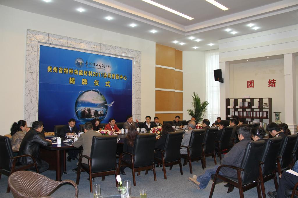 2012年11月14日上午10:00在喀斯特三楼会议室,举行了乐游棋牌“贵州省特种功能材料2011协同创新中心”揭牌仪式,会议由贵州省教育厅科研与研究生教育处熊星处长主持。
